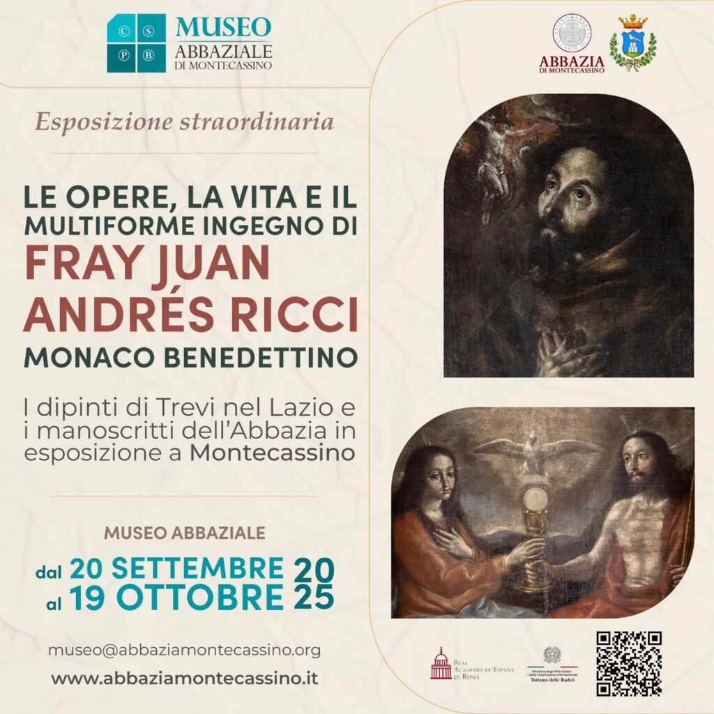 Nella stessa giornata prenderà avvio anche una significativa esposizione dedicata a Fray Juan Andrés Ricci, monaco e artista spagnolo di origini italiane, vissuto nel Seicento. Dopo un periodo nel monastero catalano di Montserrat, Ricci si trasferì a Montecassino nel 1665, dove rimase fino alla morte (1681).