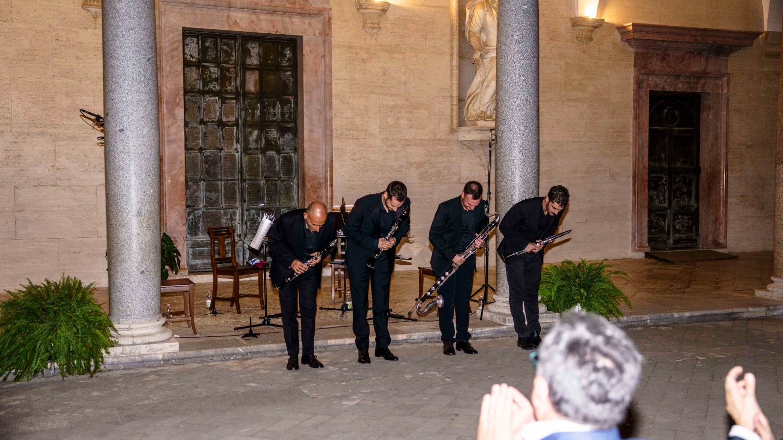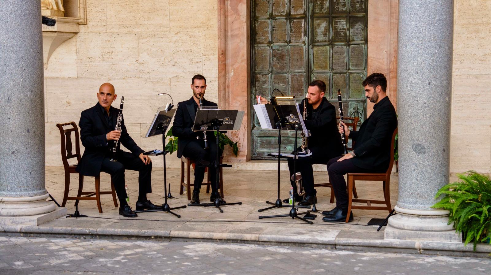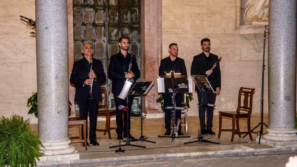 L’ensemble di clarinetti, nato all’interno della prestigiosa Banda dell’Esercito Italiano e composto dai Maestri Vincenzo Isaia, Gianmarco Corinto, Fabrizio Fornataro e Francesco Goti, ha offerto al pubblico un viaggio sonoro di grande raffinatezza. La versatilità e la ricchezza timbrica dello strumento a fiato, nelle mani dei quattro musicisti, hanno dato vita a interpretazioni vibranti, accolte con calorosi applausi dai presenti.