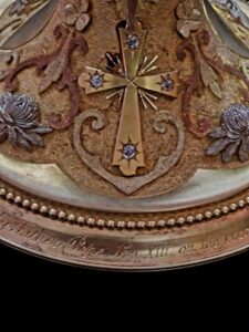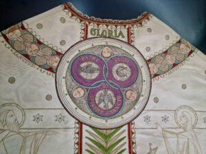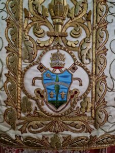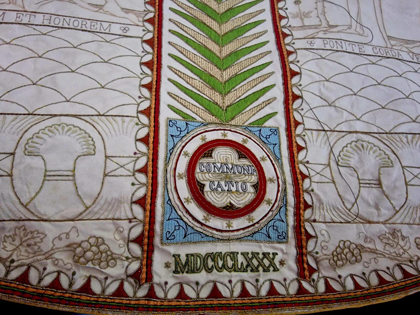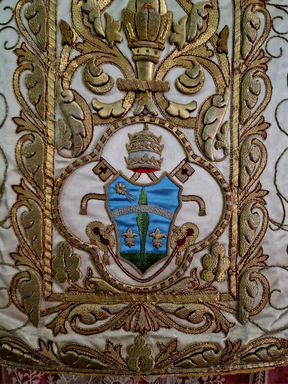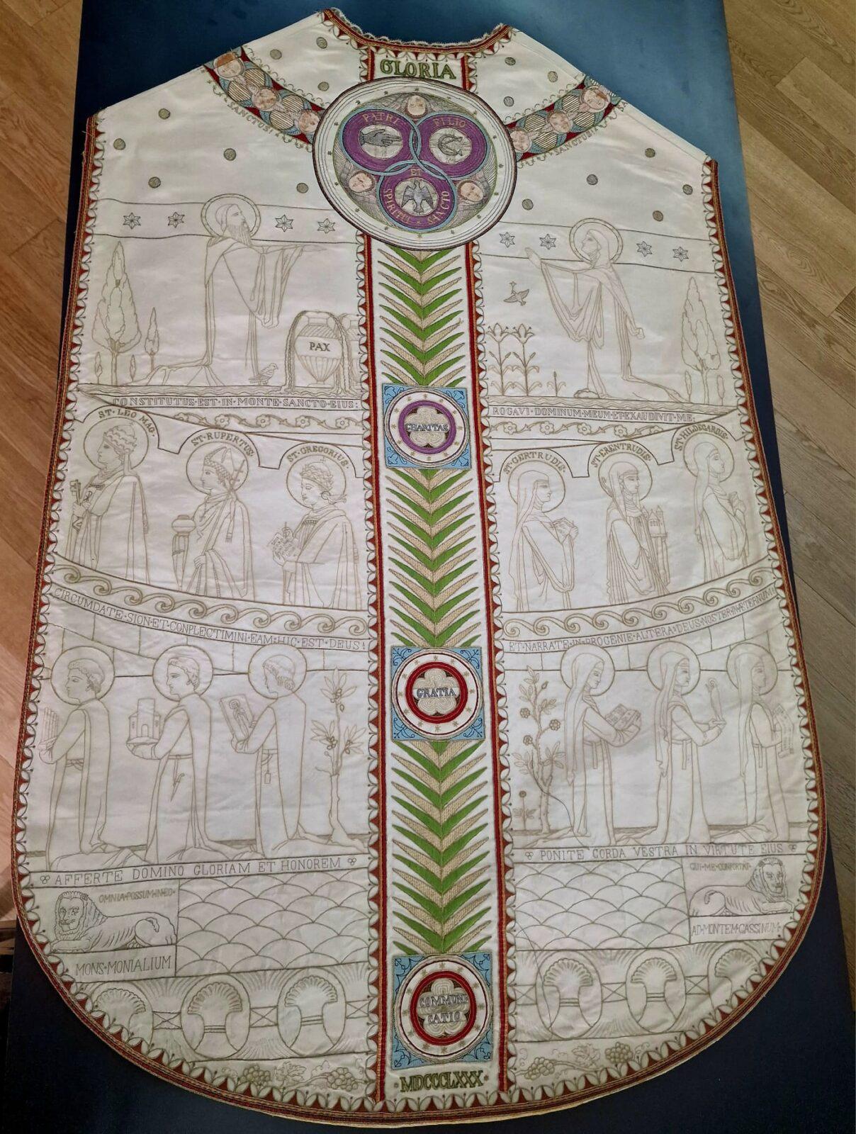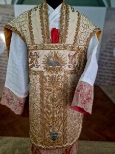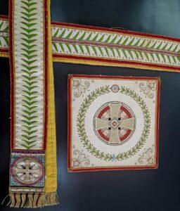 L’altra pianeta, che sarà in mostra insieme alla stola, al manipolo e alla borsa da calice del medesimo parato, fu invece realizzata nell’atelier dell’Abbazia benedettina di Beuron e donata a Montecassino in occasione delle celebrazioni per i 1400 anni dalla nascita di San Benedetto. Sulla pianeta, in basso, è riportata in cifre romane la data dell’evento: 1880.