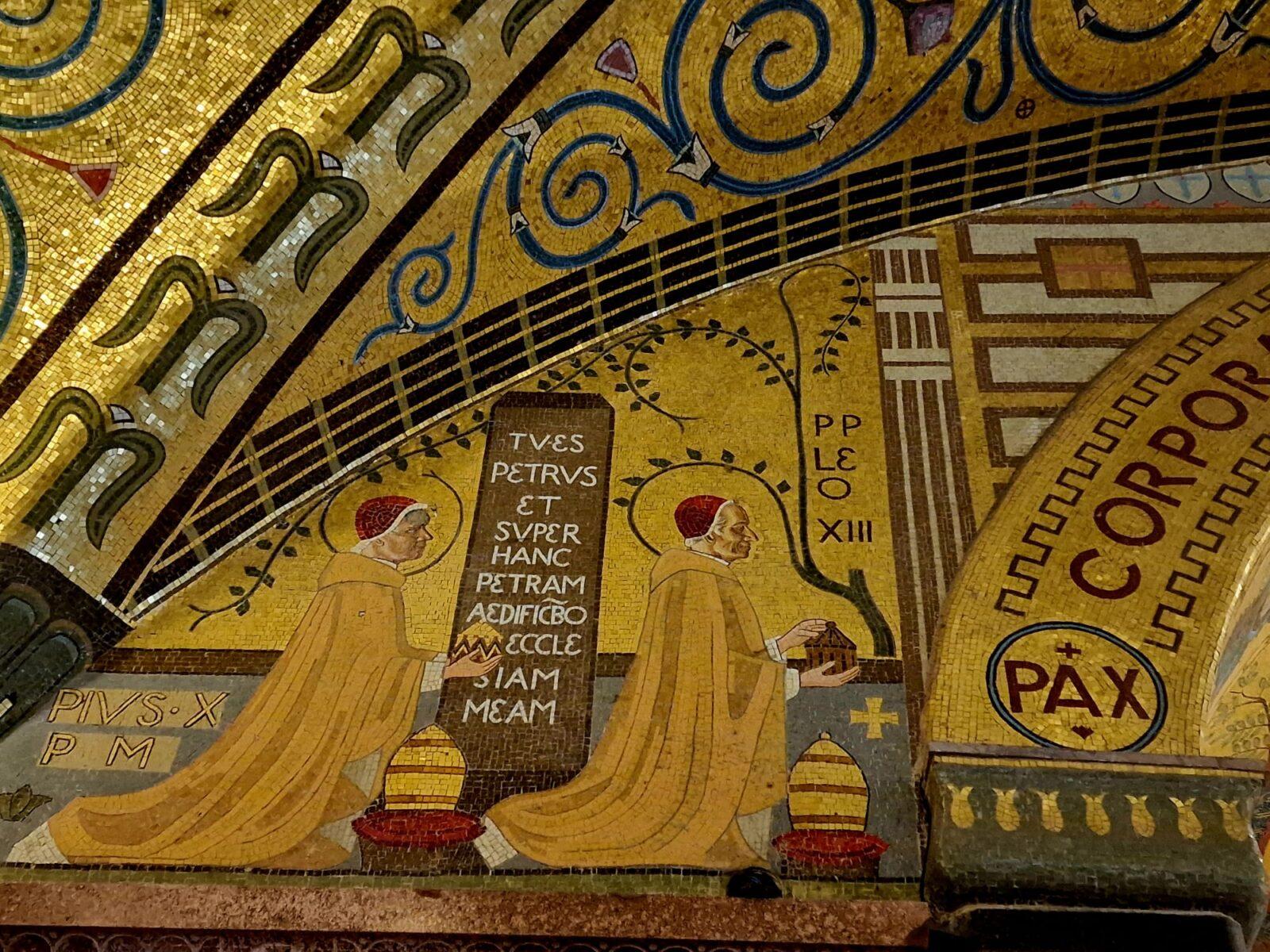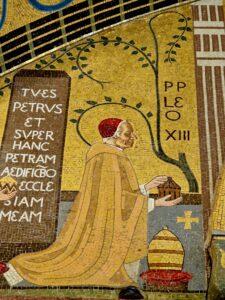 E proprio il 18 Maggio 1880 un legato di Papa Leone XIII consacrò l’ appena restaurata Torretta antica del monastero di Montecassino. La sistemazione dei locali della Torretta spettò proprio ai monaci della scuola di Beuron, che vi realizzarono una nuova decorazione pittorica e scultorea e che negli stessi anni ricevettero l’incarico di rinnovare anche la Cripta della Basilica, che sarebbe stata inaugurata nell’anno 1913. E un riferimento a Papa Leone XIII si trova anche nella decorazione musiva della Cripta stessa.